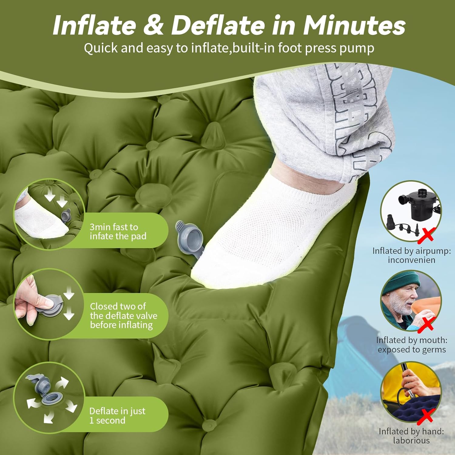 No mouth blowing, no extra pump, wide sleeping pad features a built-in foot pump. It takes only 3mins to fully inflate this thick queen sleeping pad by foot pressing, no mouth, no hands, clean and hygienic, even kids can finish inflating