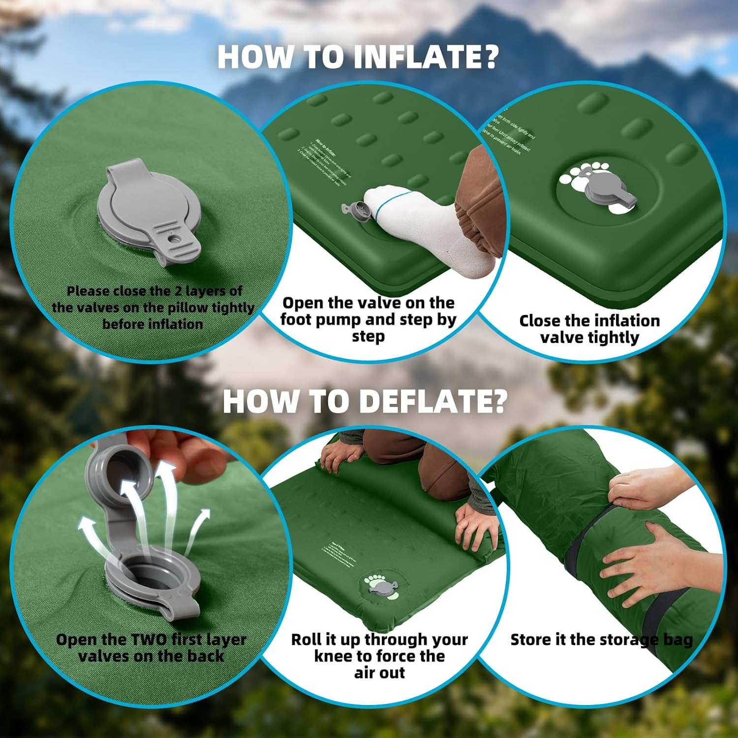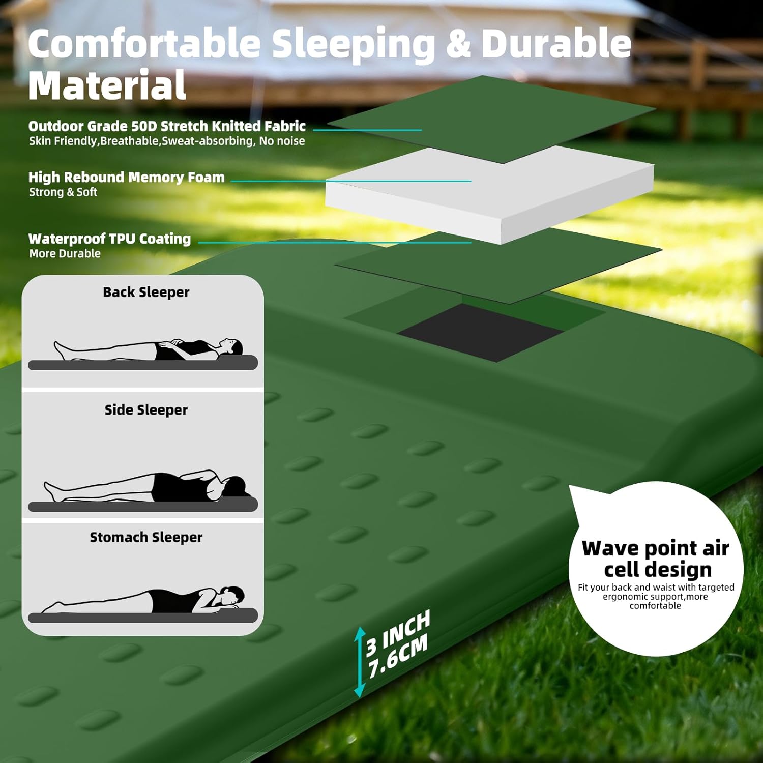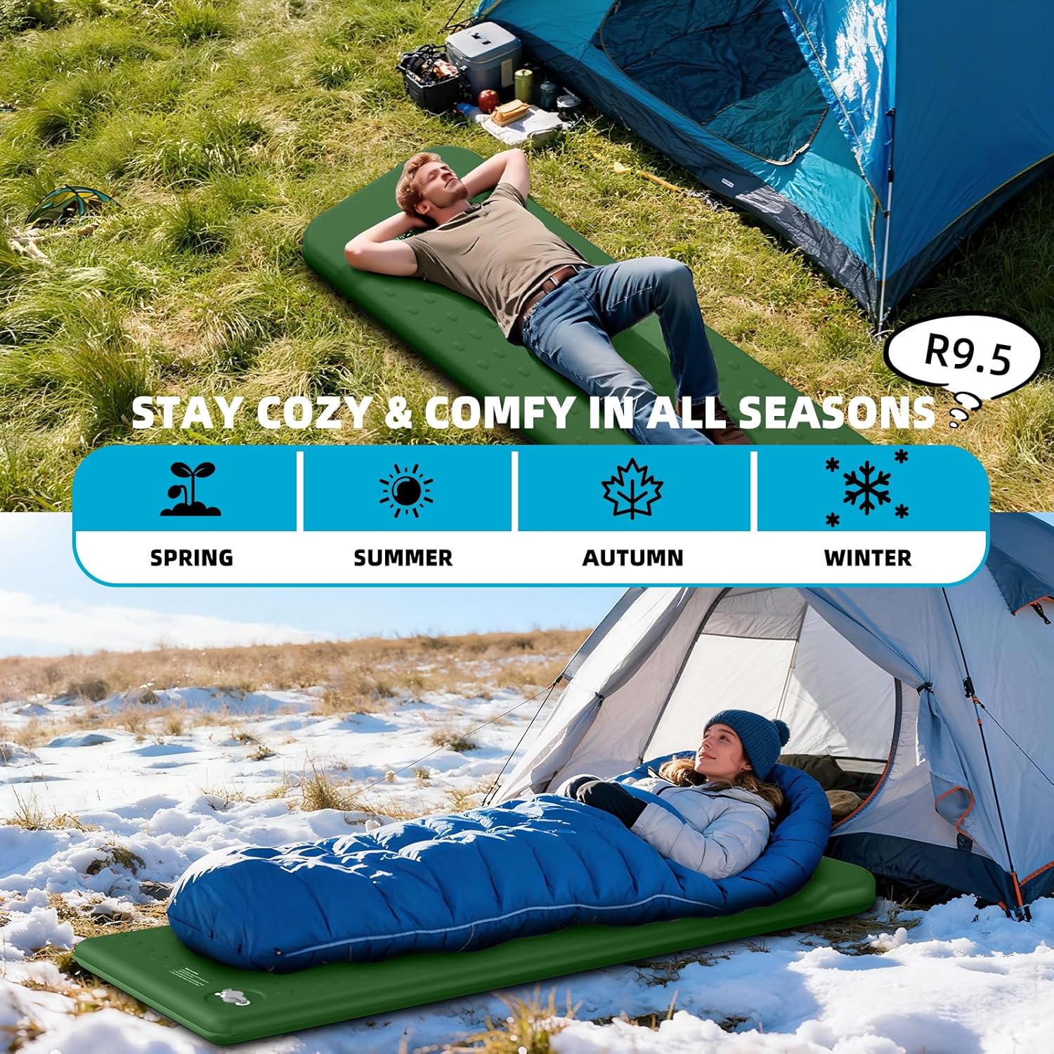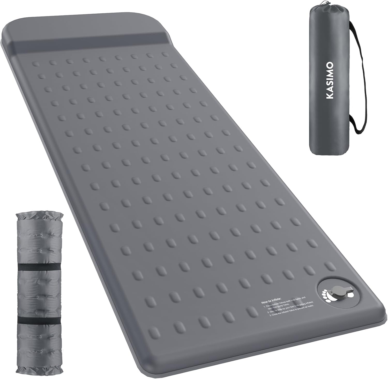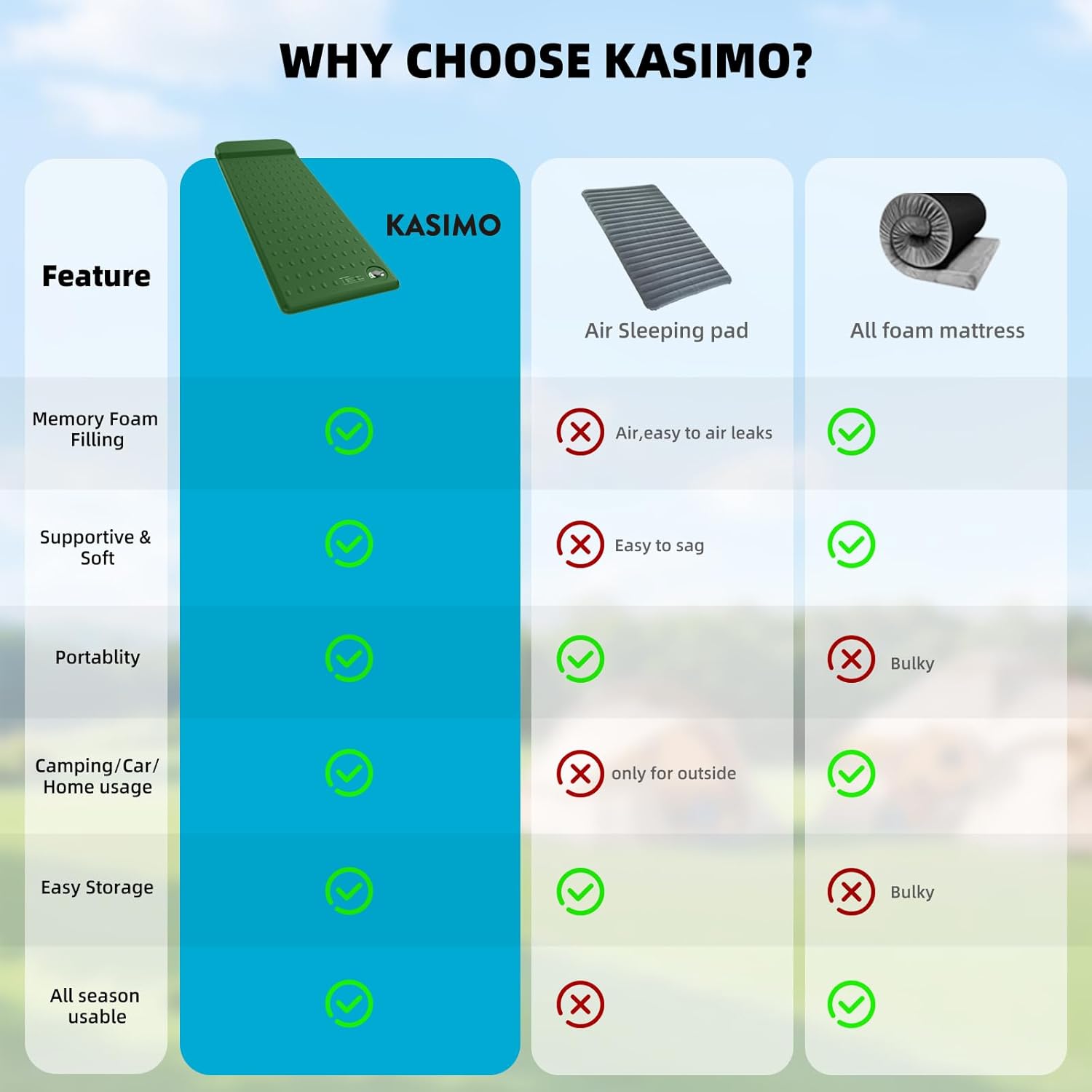 KASIMO Memory Sleeping Pad for Camping, 3″ Compact Ultra-Thick Foam Sleeping Mats with Pillow, 9.5 R-Value Insulated Camping Mattress Pad or Car Travel Backpacking Tent,Home