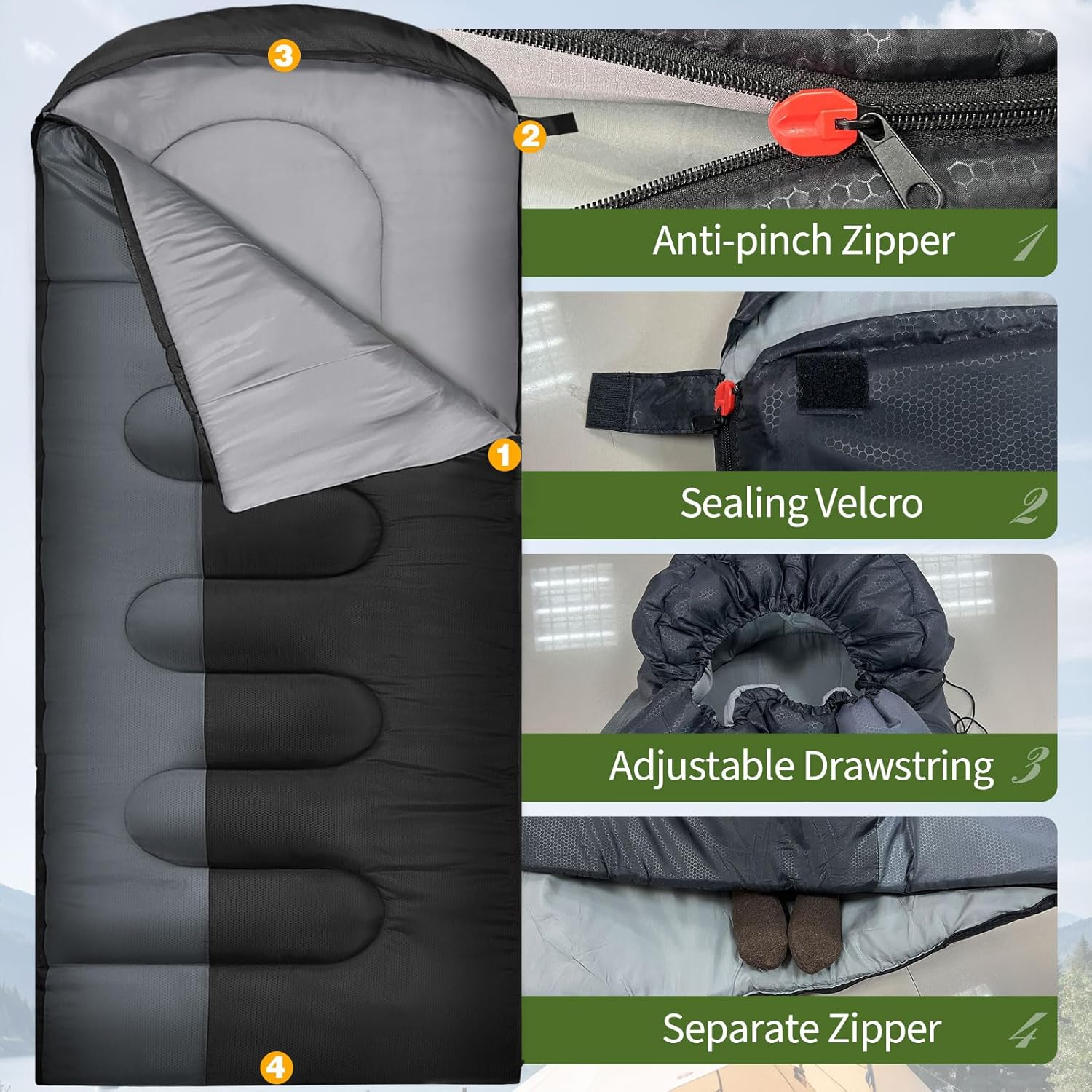 WKFAMOUT XL 10 Degree Sleeping Bags Waterproof for Adults 350GSM Machine Washable with Compression Sack for 3-4 Season Camping Outdoor